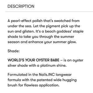 *New without box, never used or swatched. NAILS.INC What the Shell? Pearl effect nail polish in World’s Your Oyster Babe, Full Size, .47 fl oz.