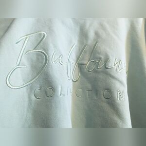 The Cloud Crop has a crew neckline and a cropped, relaxed fit. It has the Buffbunny logo embroidered across the front and on the back. It features a raw-edge hem and is made with a fabric that has a brushed, soft feel on the outside and is a warm and cozy fleece on the inside.