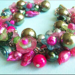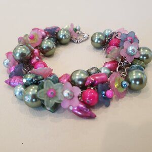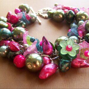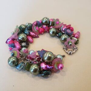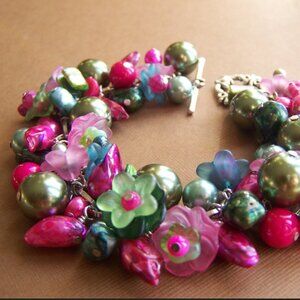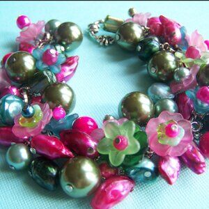 This fun bracelet is in shades of green in fucshia. Made with green, fucshia, and teal freshwater pearls with large light olive green acrylic pearls, acrylic flowers, and more.