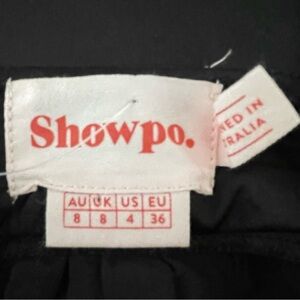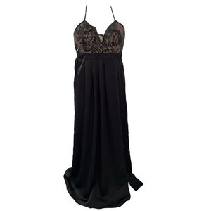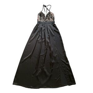 Showpo. studded black halter strap satin maxi slip dress, plunge neck, Sz: US 4
