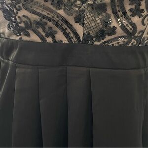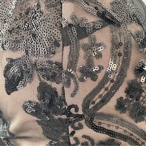 Style: Invisible center back zipper & hook-and-eye, Cross-back tie fastening, V-neckline, Low back, Dart detailing on bust cups, Durable satin finish, embellished with black shiny sequins, Embellishment detail on the bodice, Thigh split, Partially lined (bust, not see through)