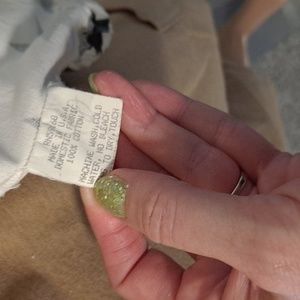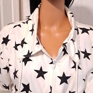 This fun jacket by Karen Kane is white with black stars. It has a full front zipper closure, three front zipper pockets, and a draw string waistline tye. It is 100% cotton and has elastic around the sleeves and waistline. Excellent condition.