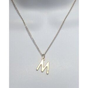 Cute and casual gold letter M necklace. It's on a gold tone chain with a lobster clasp closure. It has a small capital letter M pendant in gold tone metal. The front is smooth, while the back is textured. There is a small bubble underneath a spot of the gold tone finish on the front. See photos.