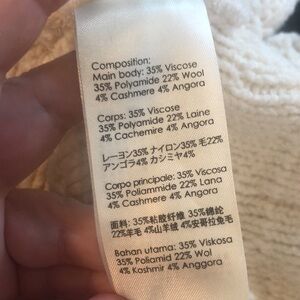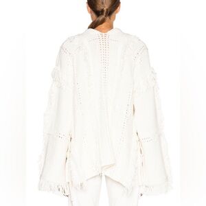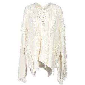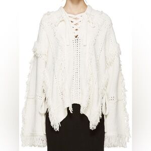 Long sleeve more blend sweater and Ivory. Crochet paneling and fringe throughout. V-neck collar with tonal lace-up closure. Poncho styling with side slots and toes. Drop shoulders and oversize fit.