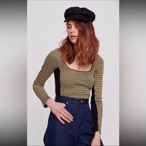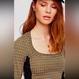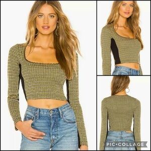 Free People Gold Herringbone Crochet Lace Detail Crop Long Sleeve Tee T-Shirt