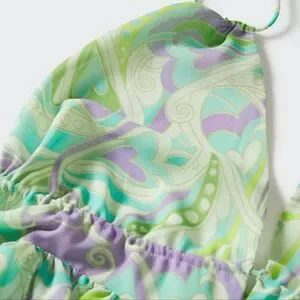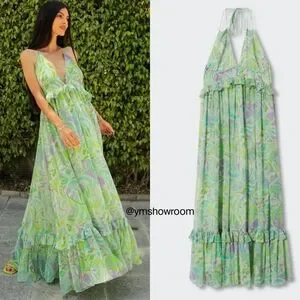 Multicolor print. Long design. Evasé design. Maxi dress design. Crew neck. Thin straps. Multi-position straps at the back. Open back. Ruffle details. Inner lining. Party and events collection.