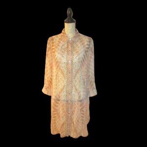 Chico's Women's multi Colored Pink Brown Sheer 3/4 Sleeve Button Side Slit Tunic Blouse Top