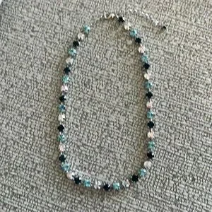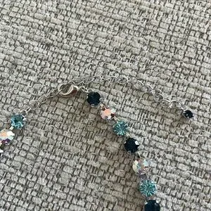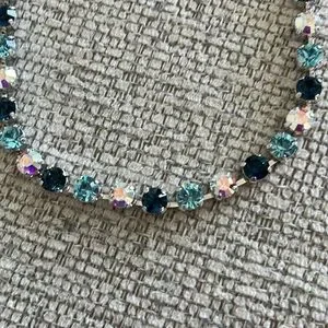 Brand new without tags Touchstone Crystal necklace silver with alternating dark blue, light blue and aurora borealis crystals. Is 19” long including the adjustable chain.