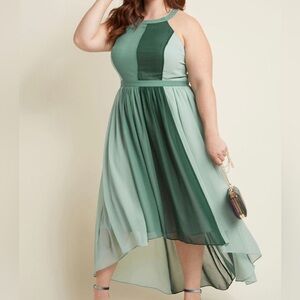 ModCloth Peachy Queen Halter Color Block Hi-Low Flowy Maxi Dress In Pear