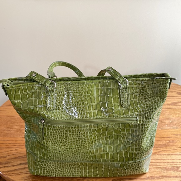 Pea green colored crocodile patten leather Bag with silver hardware and accents zipper closure multiple pockets excellent condition