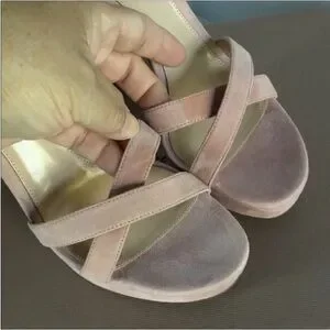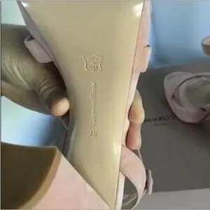 Authentic suede ankle strap sandals. Covered block heel. Cross strap bands. Open toe adjustable strap leather lining and sole. Color reads BIEGE but I say are more on the very light pink ash. Camoscio Dahlia Euro size 38 UAS 8-B heel high 5” platform 1”