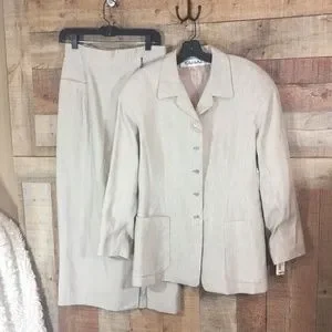 Skirt and Blazer. The skirt laid flat measures approximately 15.5" across x 36.75" long. Off center slit of 17.5" and 2 faux front pockets. The 5 button, 2 pocket blazer measures approximately 20" across the chest, just under arms and 30.5" long in the front, 29.5" back. It also has shoulder pads sewn in the lining. Both pieces are fully lined with the original tags attached. 56% Linen 44% Rayon. Please check measurements for sizing and feel free to ask any questions!