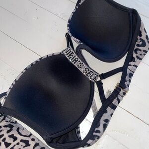 Black and gray leopard print bikini with rhinestone details. Top is 36 D bottom size large. Amazing condition only worn once.