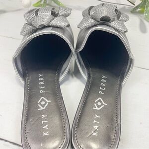 Metallic gray slip on shoes with lovely metallic bow accented with tiny gems to give a sparkly look.