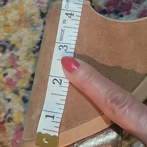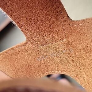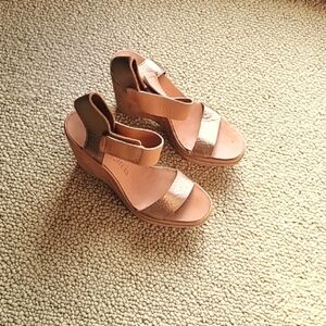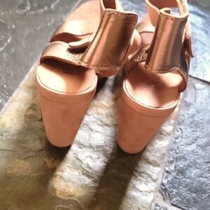 A soft rose gold leather wedge sandals size 40. The color is versatile to allow you to wear with most anything. The sole is also covered in rich leather. They will go with all your spring and summer wardrobe. Both sexy and beautiful 😊 The photos don't quite express the quality. In general, pictures don't do them justice.