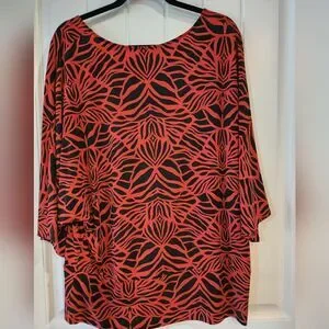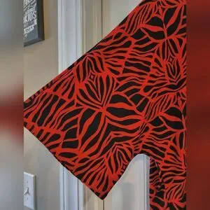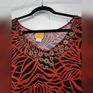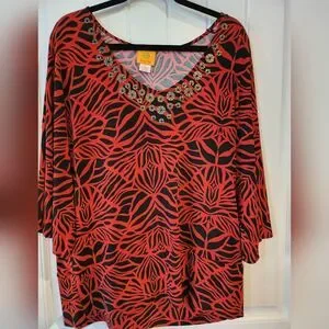 This Ruby Rd. top in XL features a striking black and red zebra chevron print accented with brass embellishments around the necklines. Crafted from 95% polyester and 5% spandex, it's lightweight and comfortable. With mid-length sleeves and a 5-inch width across the bottom, it offers a flattering silhouette. In like-new condition, this top is both stylish and versatile, perfect for adding a bold touch to any outfit.