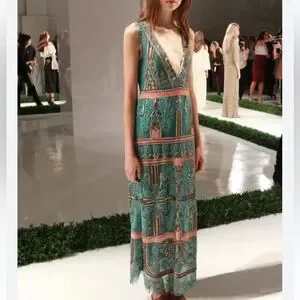 This rare, handmade Boho maxi by Rachel Zoe features allover bead and sequin embellishments and a plunging v-neckline.