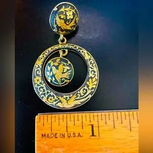 Vintage Damascene Ornate Black and Gold Birds and Flowers Hoop Earrings. Vintage- Pre-owned. Rare Find! Good condition. Post earrings. These are elegant and gorgeous earrings with a birds and floral design. Approximate dimensions: hangs down about 1 3/4 inch x 1 1/8 inch.