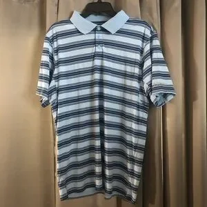 This is a Columbia Collared Striped Golf Polo. The colors are light blue, and dark blue. It’s a size large. It is lightly used but in great condition with no stains and holes. Pictures are of actual item you will receive. Item comes from a smoke free and pet free home.