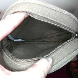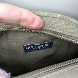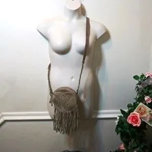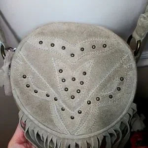 EUC Very pretty and fun, boho, hippie style suede fringed tan circular canvas crossbody purse with suede studded front and braided suede/canvas strap, from Earthbound Trading Co. Purse has top zipper, is fabric lined, and strap has buckle adjustment. There might be a few tiny spots on suede, should be able to get them out with a suede brush. Please see all photos.