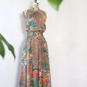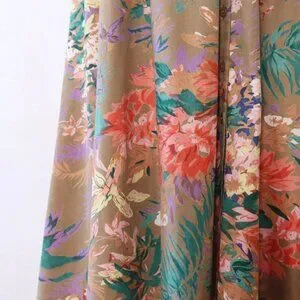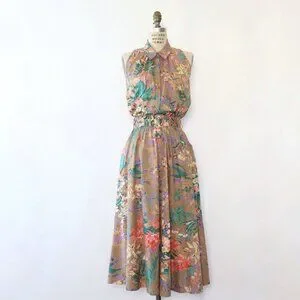 Vintage 1980s/1990s Tan Tropical Floral Belted Midi Dress Small/Medium