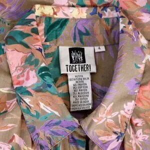 Kind of *the* perfect dress!! Dreamy painterly tan coral and teal floral pattern in a very soft cotton rayon blend with high collared neckline, handy pockets at the hips, buttons all the way down to the flared hem and matching belt to cinch at the (comfy) stretchy waist. Throw on a jacket and sneakers for the perfect all day all weather spring/summer look. By label Together!, made in India, circa 1980s/90s.