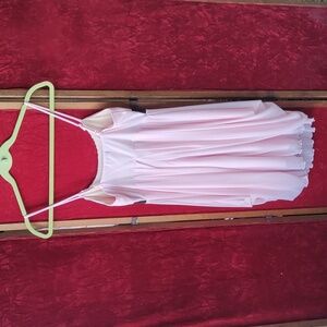 Light pink Minidress by Wet Seal. Black satin bow at the empire waist. Two flowy chiffon outer layers and a solid matching liner. Adjustable straps and elastic on the top of the bodice. 15" pit to pit 35" from shoulder to hem with the straps lengthened.