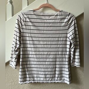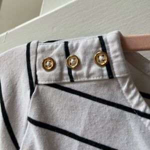 Flattering tight black and white striped quarter sleeve shirt. Three gold accent buttons on each shoulder. Looks great tucked into a pair of black trousers. The bottom of the front of the shirt tends to fold over as seen in pictures (have not tried to iron, etc).