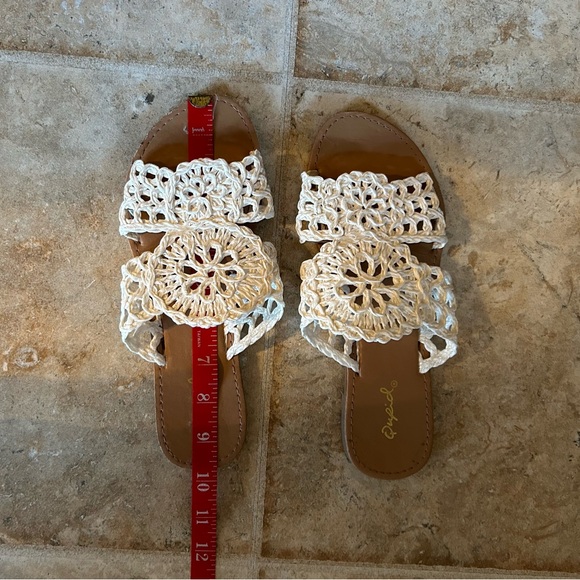 Good Used Condition, QUPID Althena-1505XX Ivory White Crochet Slip-on Flat Sandals, Size 7.5, Measurements in Pic’s.