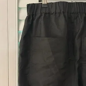 From Tibi site: This assortment serves as your WOFs (Without Fails) and are designed to create space in your wardrobe for creativity and experimentation. No matter how extreme your closet may become, these pieces serve as the grounding element that ties everything together. The crispy nylon pull on Wilt jogger quickly became a fan favorite for the creative pragmatist. The pull-on elasticized waist, functional side cargo pockets, side zippers, and the chic flap detail on the shin. Made in a nylon blend, these pants possess the relaxed elegance needed to transition from the grocery store to the office, to evening with the right shoes. This is the ultimate PDW for customers who are continuing to build out their ideal wardrobe. For a chic seasonal transition look, tuck your pants into a shaft boot and pair with a cashmere sweater.