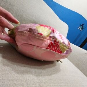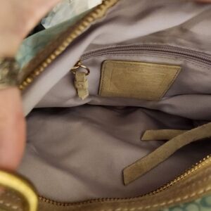 It features gold colored hardware, leather and cloth strap, and a lilac colored fabric liner with two'slip