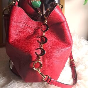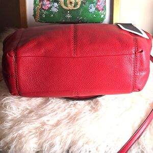COACH red lexy pebble leather shoulder bag w/ crossbody strap, tag & accessories Gorgeous red with gold hardware, added bag extender & twilly included, A trendy pop of red with the trendy bow and black accents.