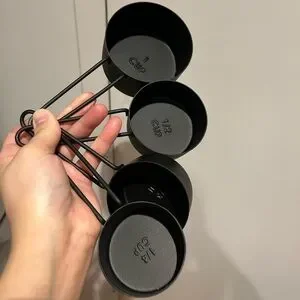 New and never used crate&barrel measuring cups in Black. 1, 1/2, 1/3, 1/4 cups measurements.