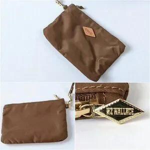 Small zippered nylon pouch with leather logo patch on front attaches to interior via removeable clip