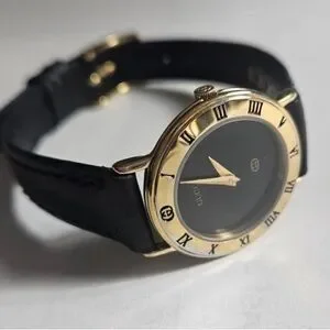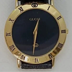 Authentic Vintage Gold Gucci Black watch leather band Roman Numeral Gucci Logo