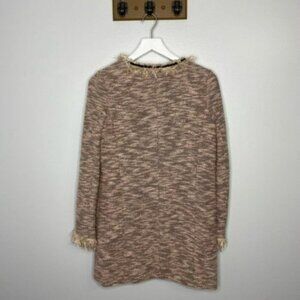 Tweed zip up coat with front pockets. Extra fabric detail around cuffs, zipper and neckline. Has metallic details.