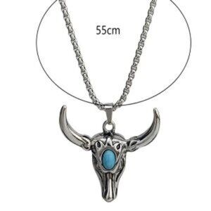 Silver Alloy Bull Head Western Vintage Pendant Necklace With Turquoise