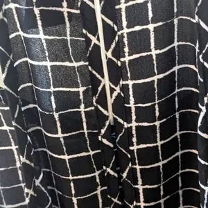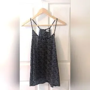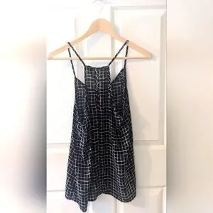 This is a sheer black strappy top with a crosshatched pattern. The polyester material is thin but breathable.