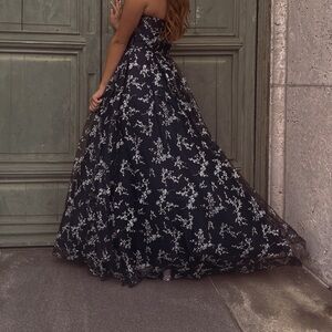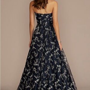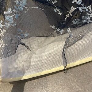 Gorgeous dress! My daughter loved this dress for prom! It has pockets that you can’t see, so caring her phone and small wallet around was easy. The last photo shows it tore at the bottom in the front but it can be easily trimmed and you won’t notice. Bought from David’s Bridal.