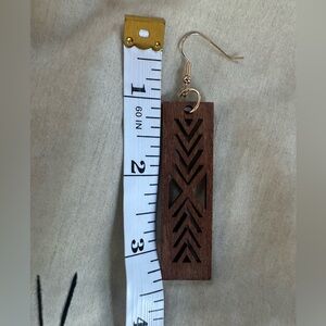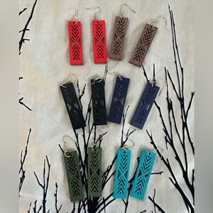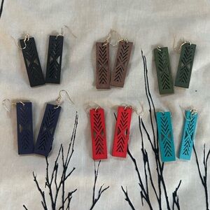 These earrings are so fun! They’re a rectangular shape with an angular, arrow-like pattern laser cut into them. They’re super duper lightweight wood and super versatile.