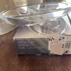 Studio Nova Iris flower oval glass dish. Beautiful piece to use in any decor style and in any place, it’s much more than a “candy dish.” I’m sorry that the box is damaged. Please see pictures as part of description.