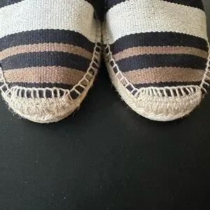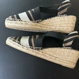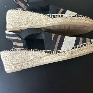 Size 9 (40)- black/taupe/cream stripe top and back strap, jute rope edging on wedge, excellent