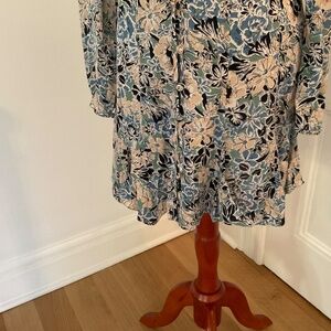 Veronica Beard Ashlynn silk Button front floral mini dress, Blue beige and green. Size 4. A swingy flounced hem goes day to night on this Veronica Beard sheath with a simple change of accessories. Blue silk (100% Silk). Hourglass. Long sleeves. V-neckline. 35" from shoulder to hemline. Imported.
