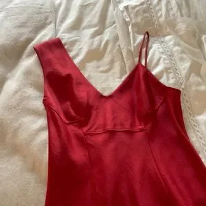 Alexander Wang red midi v neck slip dress. Asymmetrical shoulder straps play up T by Alexander Wang's Slip Dress. A subtle fit and flare silhouette made from a satin blend creates a streamlined silhouette to this elegant midi. Excellent condition.