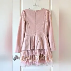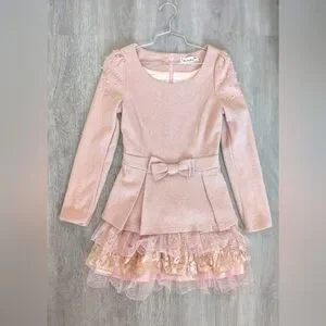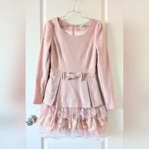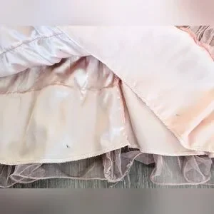 Beautiful shabby chic vintage feel dress in blush. This dress features tiny pearl details on the shoulders and is fitted at the waist. The waist is decorated with a double bow in the center. The pleated skirt has tiered ruffles of lace and tulle. Satin lining, zipper on the back.