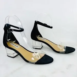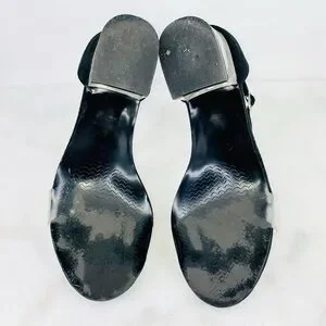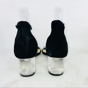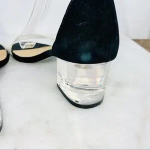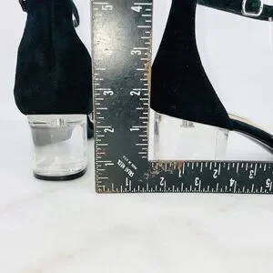 Suede and vinyl material shapes peep-toe upper and a slender strap that wraps around the ankle.