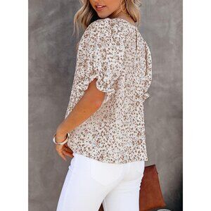 Women Brown Print Blouse Crewneck Smocked Puff Sleeve Shirts Casual Babydoll Top