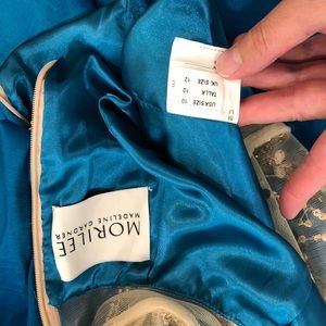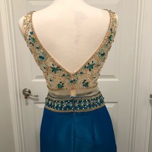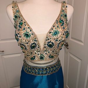 Beautiful jewel toned mermaid style gown. NWOT, this gown has the colors of a peacock with an Arabian nights flare. Intricate beading all around bodice provide the perfect amount of bling.