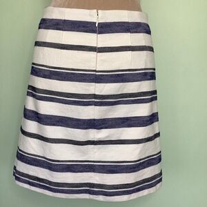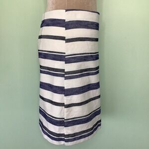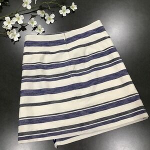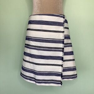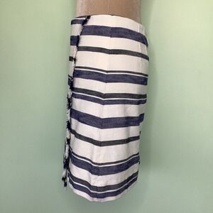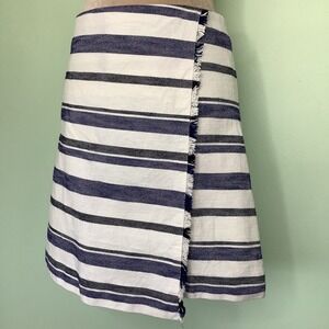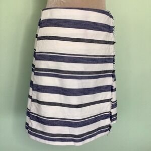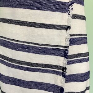 VGUC Ann Taylor LOFT skirt, size 6. Faux wrap silhouette with a denim blue and white stripe print. Woven blanket look with fringe. Fully lined, partial back zip closure with hook & eye. 100% cotton, lining is 100% polyester, no stretch. Very nice. Approximate measurements laid flat: