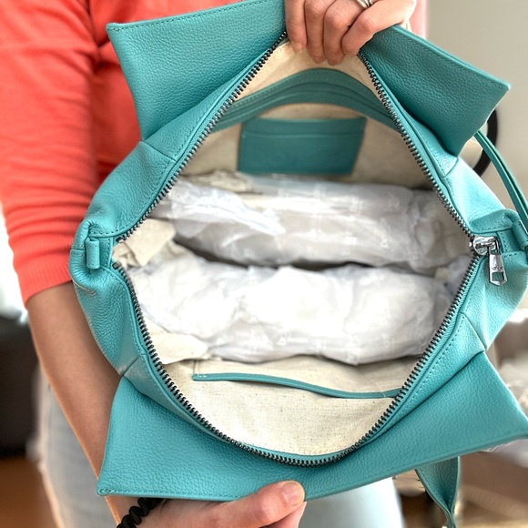 One exterior back zip pocket, one interior zip pocket, one slip pocket & two card slots